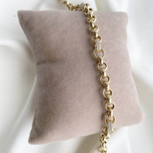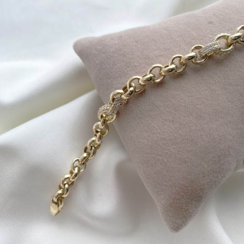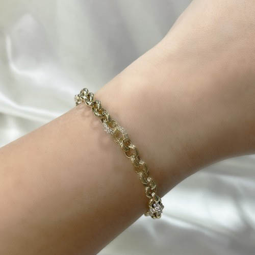 Özenle işlenmiş zincir halkaları, ışığı mükemmel şekilde yansıtırken bileğinize hareketli ve zarif bir görünüm kazandırır. 14 ayar altının parlak tonları, taşlı detaylarla birleşerek bileğinizde sofistike bir ışıltı yaratır.