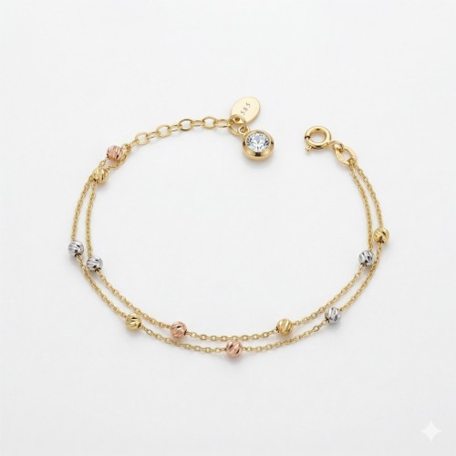 İkili zincir tasarımı, bilekliğe katmanlı ve daha belirgin bir karakter kazandırırken, aralara serpiştirilen Dorika topları her hareketinizde ışığı farklı açılardan yansıtarak göz alıcı bir parlaklık sunar. 18 cm uzunluğu ile bileği ideal bir şekilde kavrayan bu tasarım, tek başına güçlü bir stil oluştururken, günlük ve özel gün kombinlerinizin vazgeçilmez bir parçası olmaya adaydır.