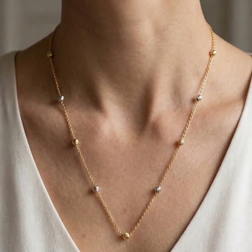 Gerçek 14 ayar altından titizlikle üretilen bu Dorika toplu kolye, klasik altın ışıltısını modern ve hareketli bir tasarımla birleştirir.