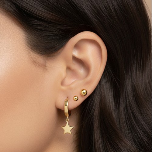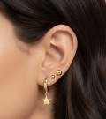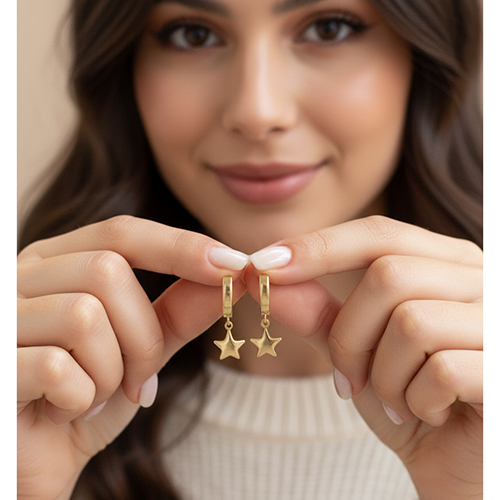 Gerçek 14 ayar altından el işçiliğiyle üretilen yıldız sallantılı halka küpe modeli, zarif ve modern duruşuyla şıklığı ön plana çıkarır.